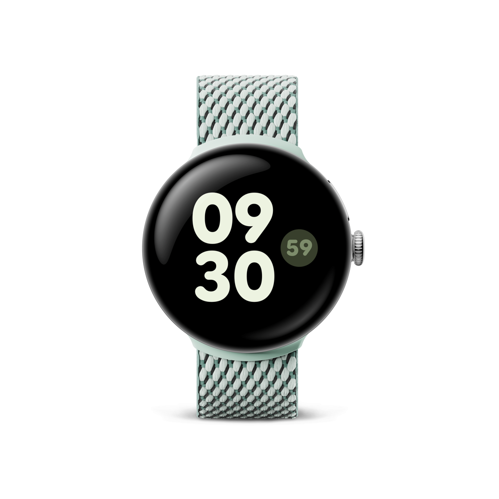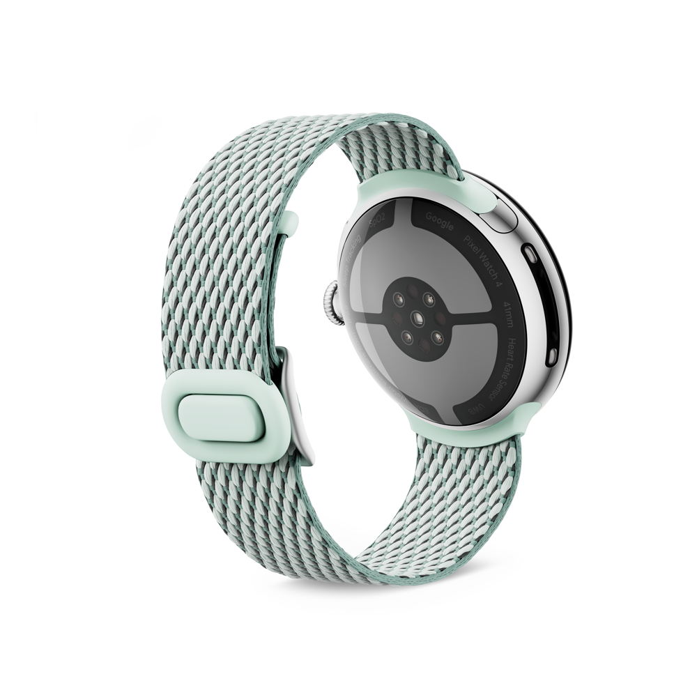 The Silver Pixel Watch 4, 41mm, with Woven band in Sage.
