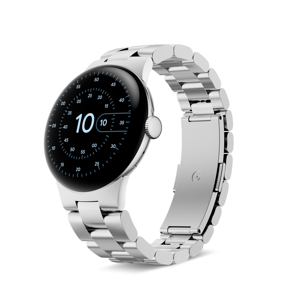 The Silver Pixel Watch 4, 41mm, with Metal Links band in Silver.