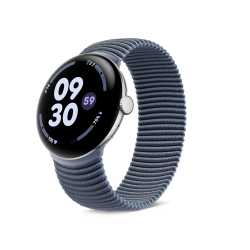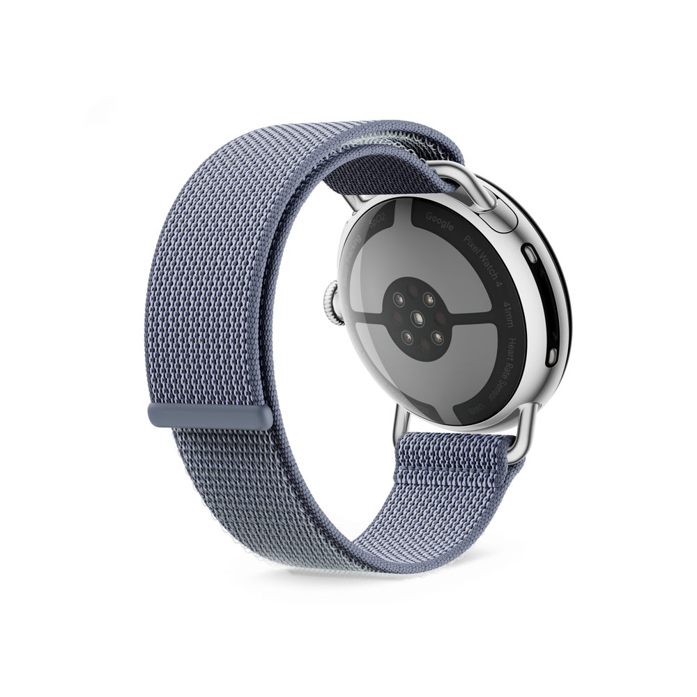 The Silver Pixel Watch 4, 41mm, with Woven band in Indigo.