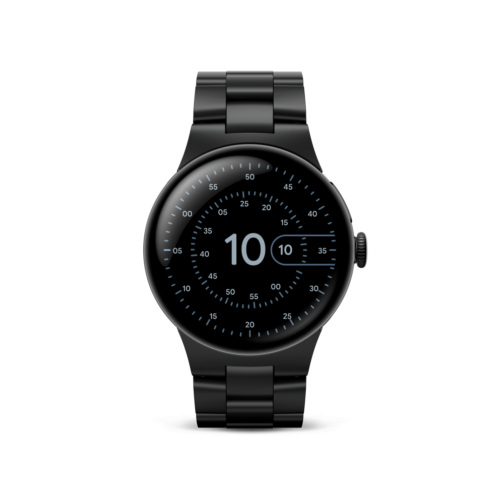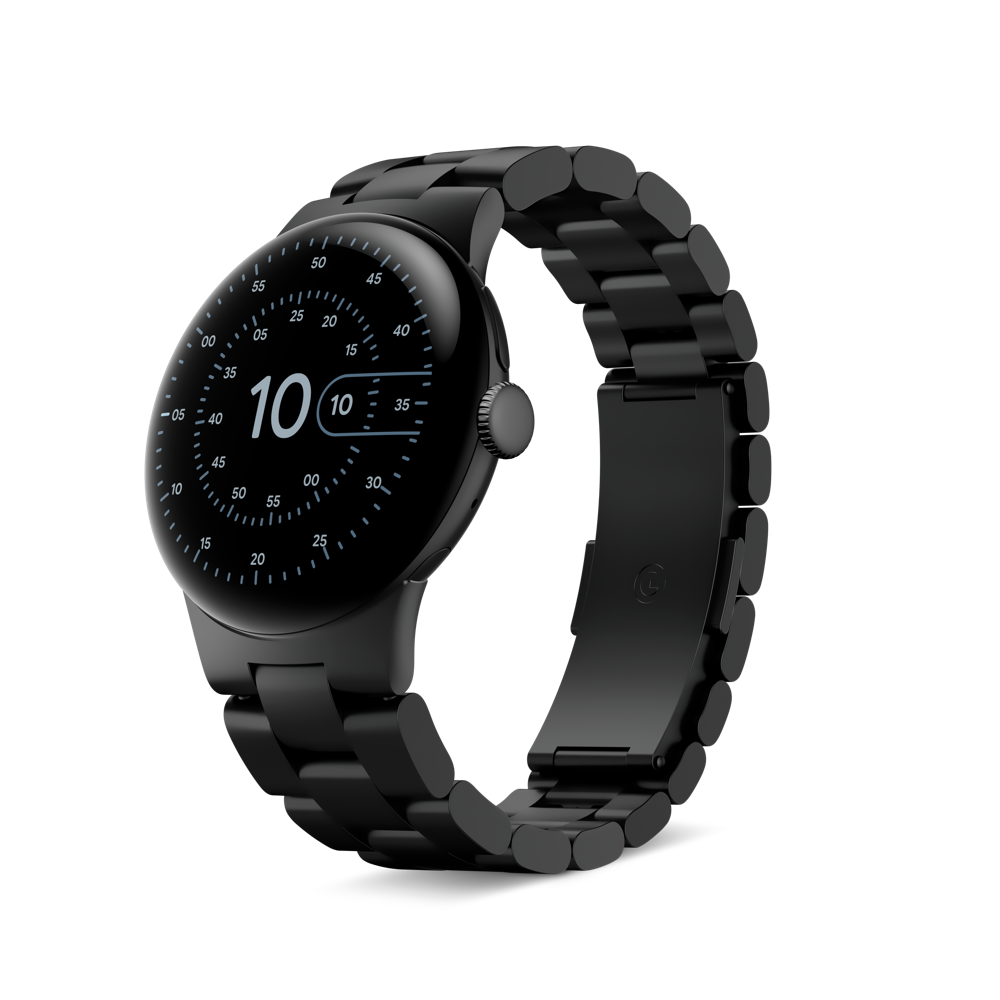The Obsidian Pixel Watch 4, 41mm, with Metal Links band in Black.