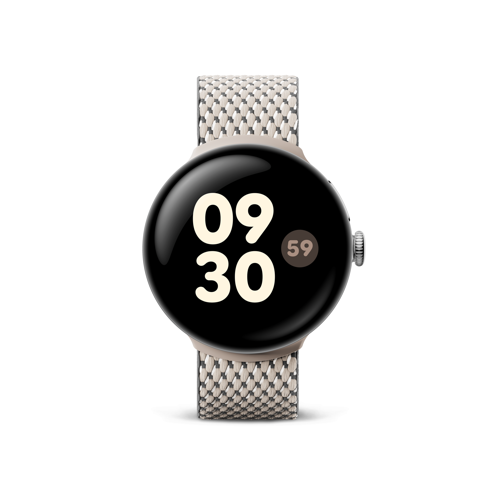 The Moonstone Pixel Watch 4, 45mm, with Performance loop band in Moonstone.