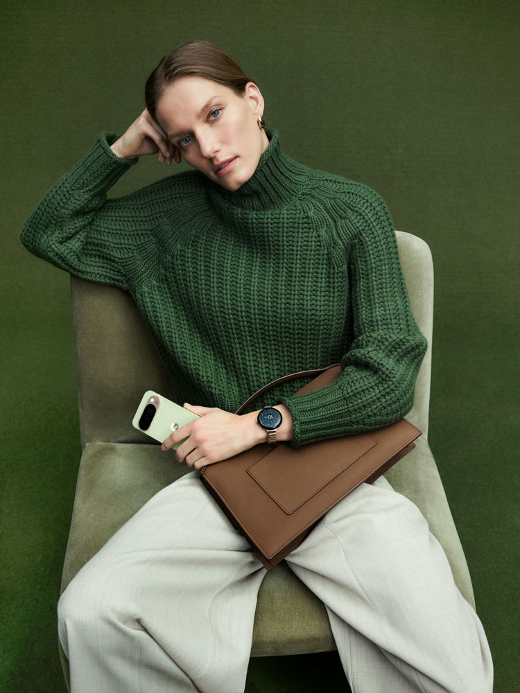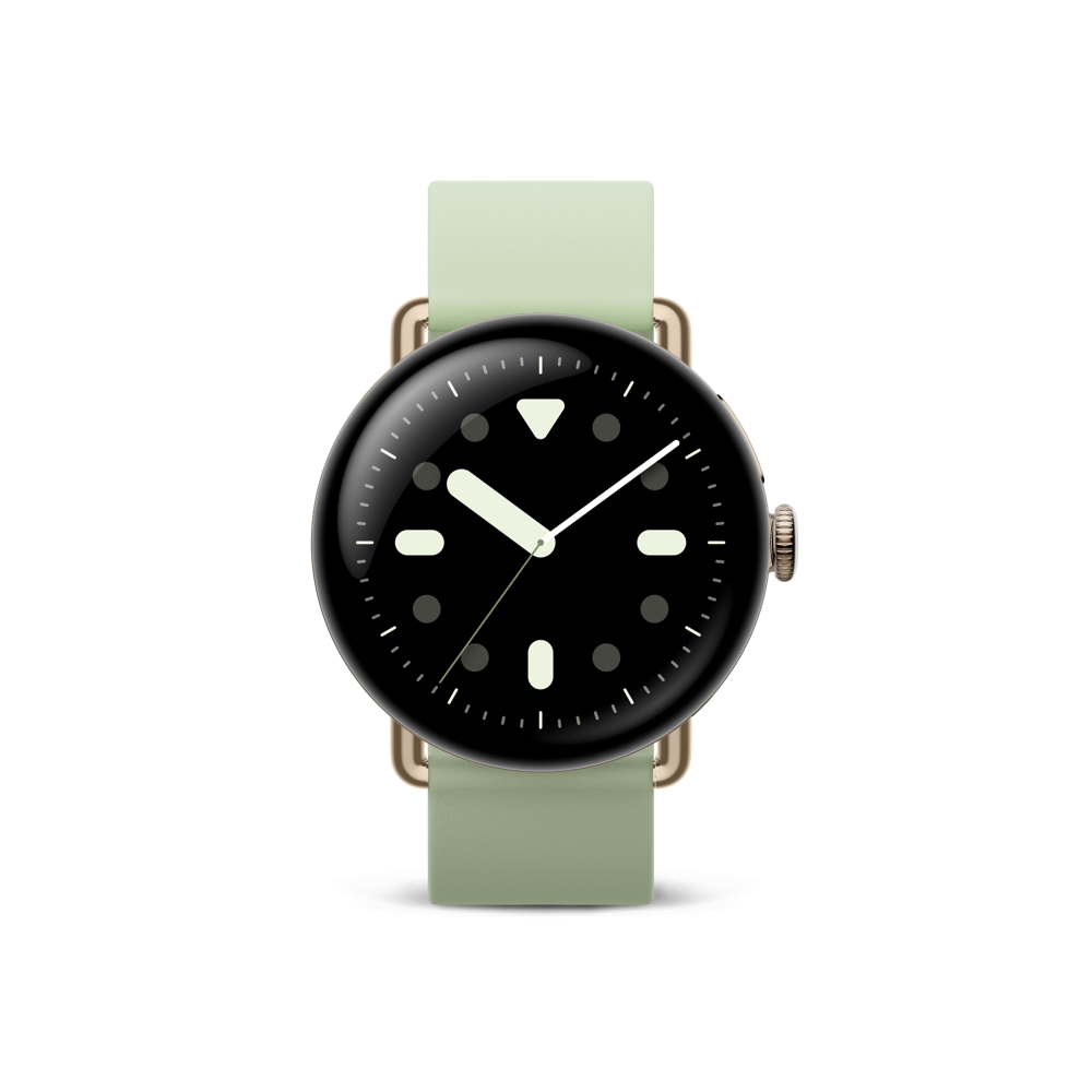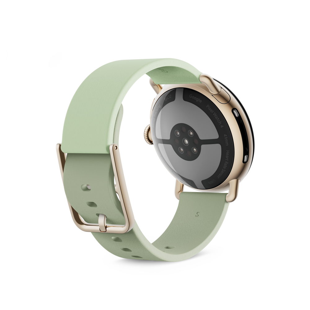 The Gold Pixel Watch 4, 41mm, with Two-Tone Leather band in Jade.
