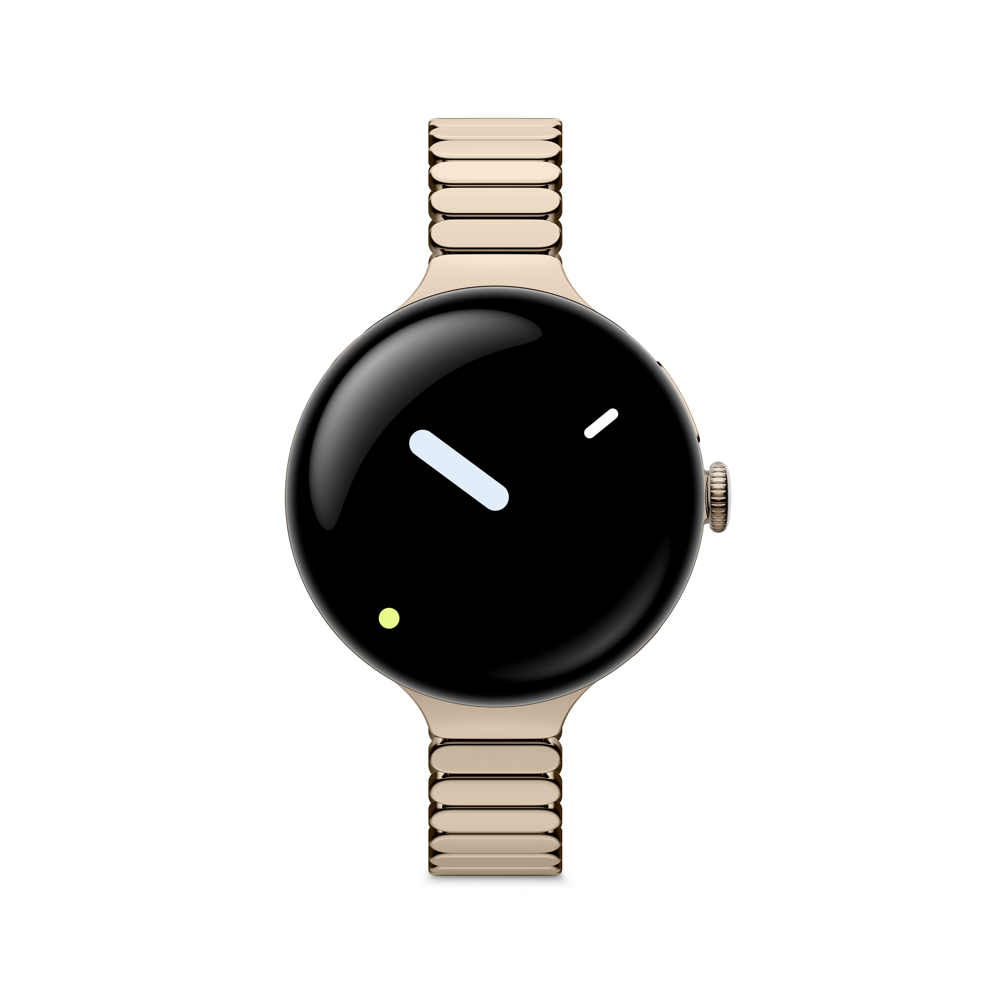The Gold Pixel Watch 4, 41mm, with Slim Metal Links band in Gold.