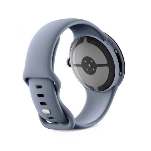 The Silver Pixel Watch 4, 41mm, with Active band in Iris.