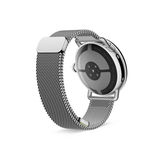 The Silver Pixel Watch 4, 41mm, with Metal Mesh band in Silver.