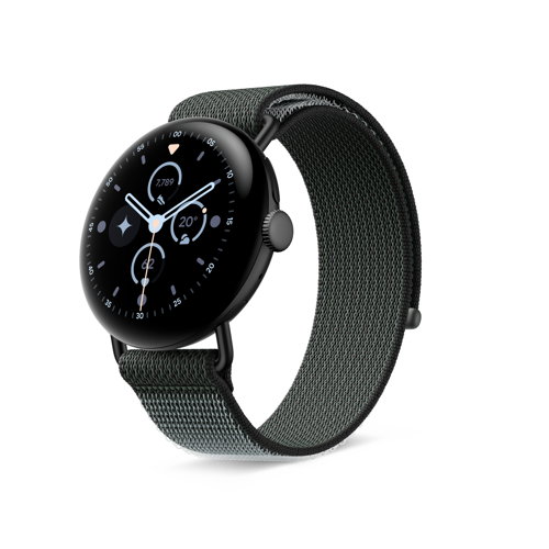 The Silver Pixel Watch 4, 41mm, with Woven band in Ivy.