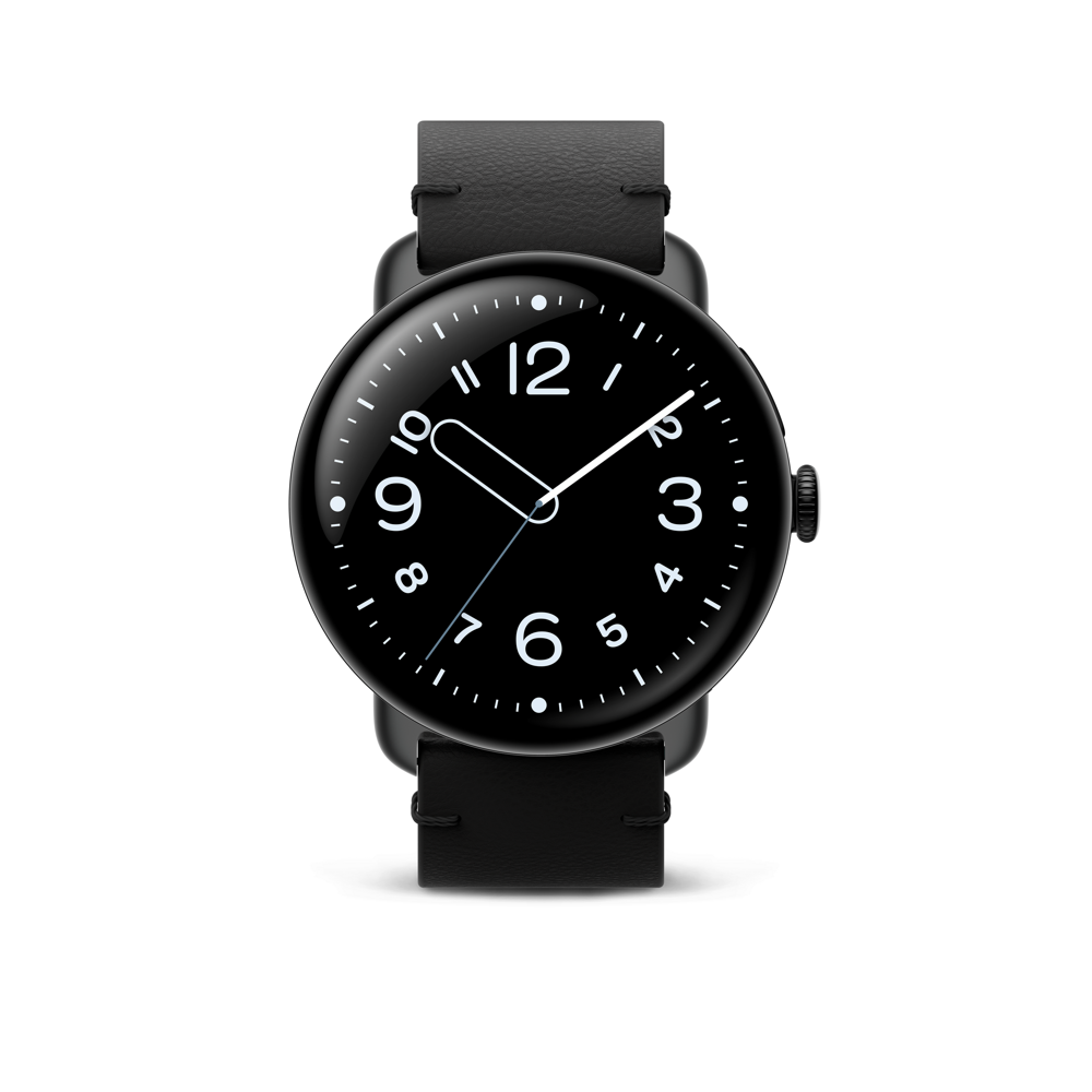 The Obsidian Pixel Watch 4, 45mm, with Crafted Leather band in Black.