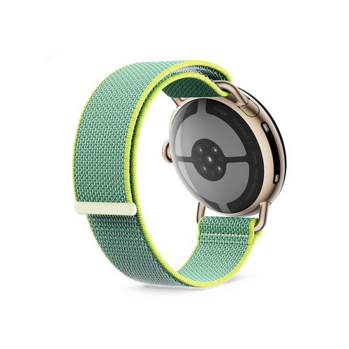 The Silver Pixel Watch 4, 41mm, with Woven band in Lemongrass.