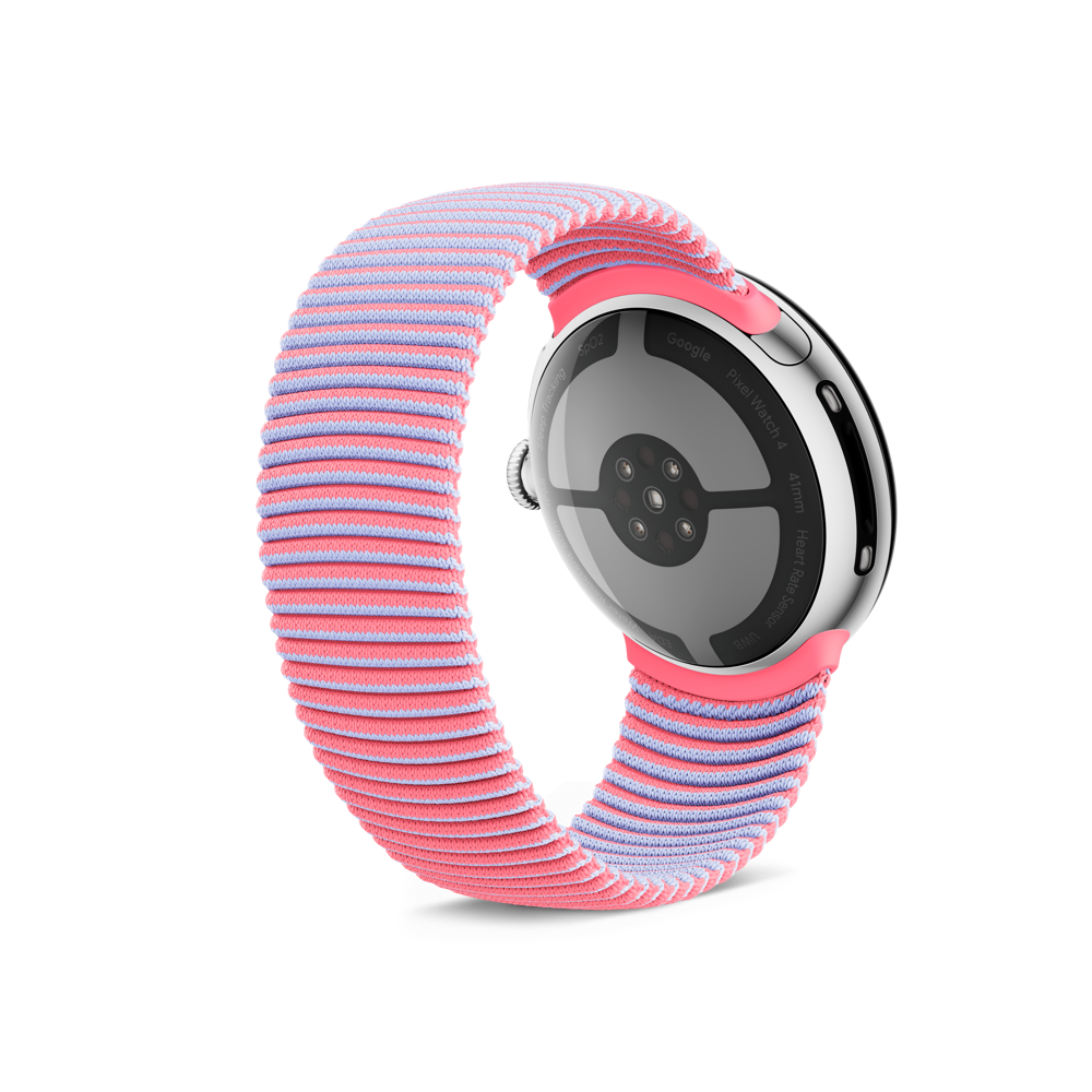 The Silver Pixel Watch 4, 41mm, with Gradient Stretch band in Peony Iris.