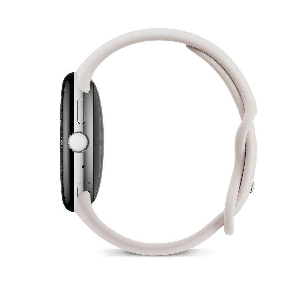 The Moonstone Pixel Watch 4, 45mm, with Active Sport band in Moonstone